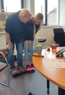 In huis heeft alles z’n plek gevonden. Kamer 1 is de creatieve ruimte geworden en kamer 10 de woonkamer. Buiten is Egbert met z’n mannen bijna dagelijks druk bezig met de fundering van de uitbouw en is het een beetje een modderige toestand. Vieze voetstappen zijn ons dus niet onbekend, maar daarvoor heeft onze lieftallige collega Lisa een hele goede oplossing: sloffen. Dus als Addie en Jacko hier zijn om over ernstige dingen te vergaderen, dragen ze hun heerlijke warme Driebrugse sloffen.